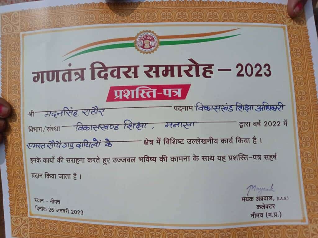 आज 26 जनवरी 2023 को गणतंत्र दिवस के अवसर पर मनासा विधायक माननीय श्री माधव जी मारू, नीमच के विधायक माननीय श्री दिलीप सिंह जी परिहार , जावद के विधायक एवं मध्यप्रदेश सरकार में मंत्री (MSME) श्री ओमप्रकाश जी सखलेचा , जिला पंचायत नीमच के अध्यक्ष माननीय श्री सज्जन सिंह जी चौहान एवं नीमच के जिला कलेक्टर महोदय द्वारा श्री मदन सिंह जी राठौड़ को अपने उत्कृष्ट कार्यो के लिए सम्मानित किया गया ।